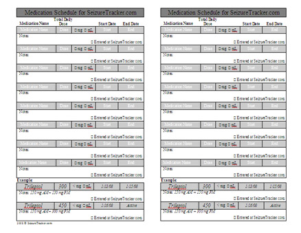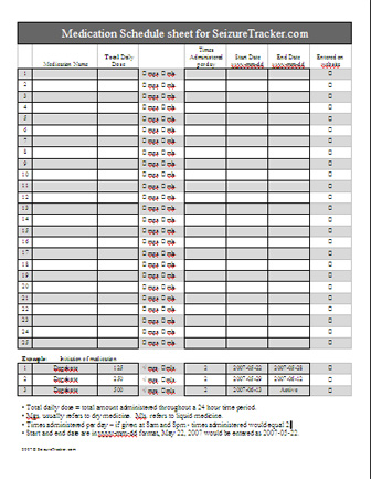 Download Seizure Medication Schedule forms and review a list of the seizure medications currently availible in the Seizure Tracker medication schedule logging tool. Please contact us at support@SeizureTracker.com if this seizure medication list seems incomplete. We would be happy to add any epilepsy related medications that may not be listed.